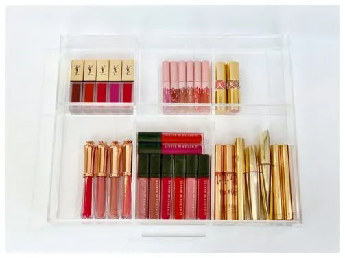 The grid insert has 6 pockets and is great for lipsticks, lip glosses, and tons of eyeshadow. You can place your products in a variety of ways in either the lid area or drawers. The grid insert is very versatile and the pockets can be adjusted to create a combination of six equal sections or a three short and three long sections. Our newest X inserts serve as a multi-functional design and can create larger sections by stacking both pieces to one side. Grab a ton of slide sets to create elongated columns with adjustable widths for longer items such as makeup brushes or jewelry.