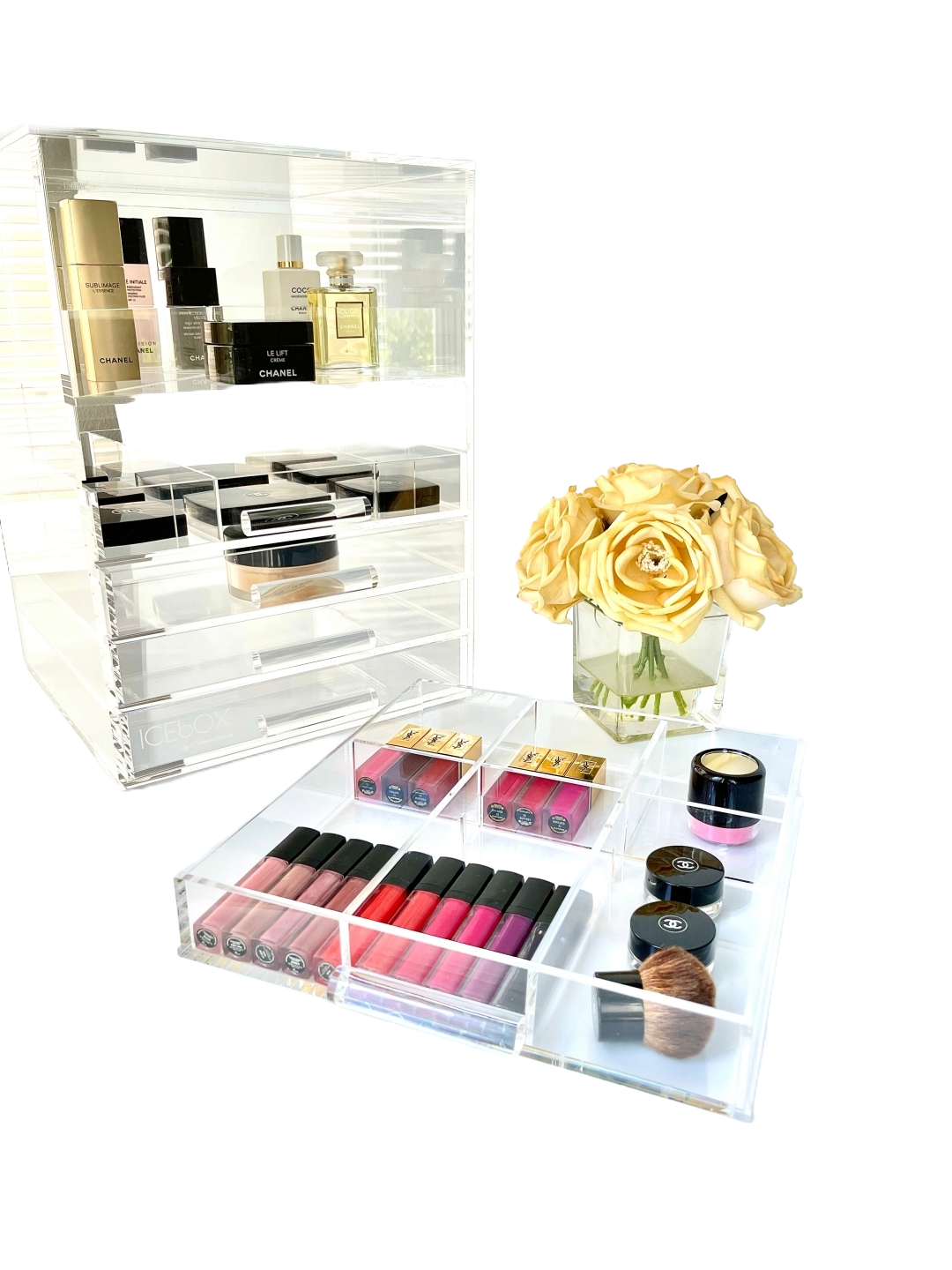 This design is perfect for those with limited counter space. The popular 5" height of the lid shelf allows products such as foundations, creams, moisturizers, nail polish, perfumes and much more, to stand upright and be beautifully displayed. To stand even taller bottles upright, simply fold the lid all the way flush against the back of the ICEbOX and it disappears!